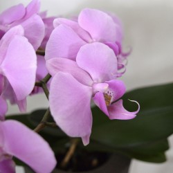Pianta di Orchidea Phalaenopsis con vaso in ceramica marrone e grigio scuro.